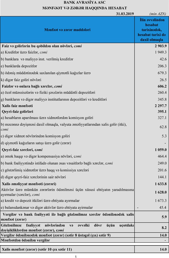 “Bank Avrasiya” ASC 2019-cu ilin 1-ci rübünü 14,1 min manat xalis mənfəət ilə başa vurub. Halbuki, bank 2018-ci ilin 1-ci rübünü 3 milyon 234 min manat xalis mənfəət ilə bağlamışdı. Beləliklə, “Bank Avrasiya”nın xalis mənfəəti 231 dəfə azalıb.