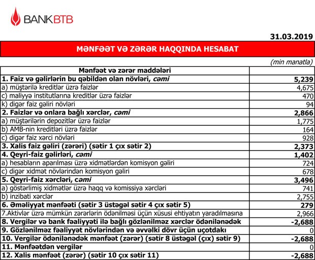 Müqayisə üçün qeyd edək ki, 2018-ci ilin yanvar-mart dövründə “Bank BTB”nin cəmi gəlirləri 5 milyon 394 min manat, cəmi xərcləri 5 milyon 425 min manat təşkil etmiş və 31 min manat əməliyyat zərəri yaranmışdı. Əvvəlki dövrlərdə yaradılmış ehtiyatın 329 min manatının azad olması hesabına həm əməliyyat zərəri bağlanmış, həm də 298 min manat xalis mənfəət yaranmışdı.