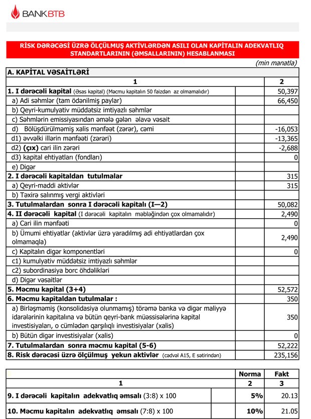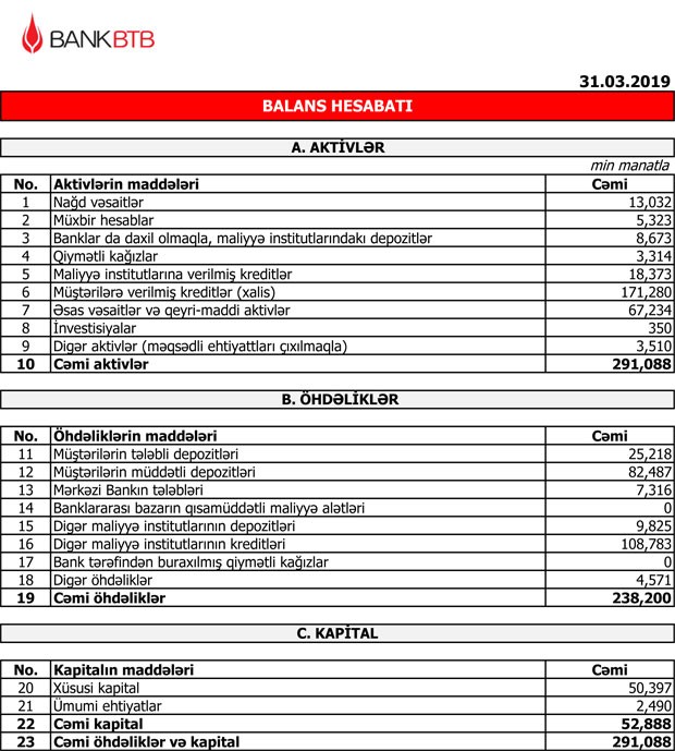 31 Mart 2019-cu il tarixində “Bank BTB” 52 milyon 222 min manat məcmu kapitala malik olub.