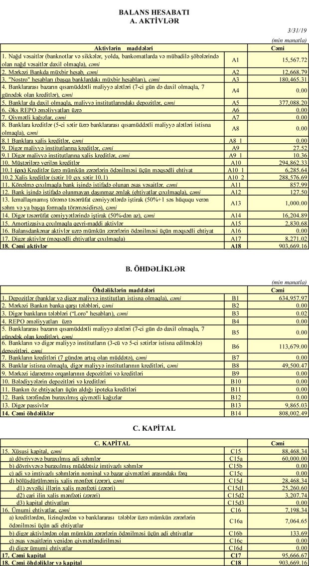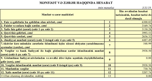 Müqayisə olunan dövrdə, Bankın faiz gəlirləri 6 milyon 130 min manatdan 6 milyon 300 min manata, qeyri-faiz gəlirləri isə 1 milyon 960 min manatdan 3 milyon 993 min manata qalxıb.