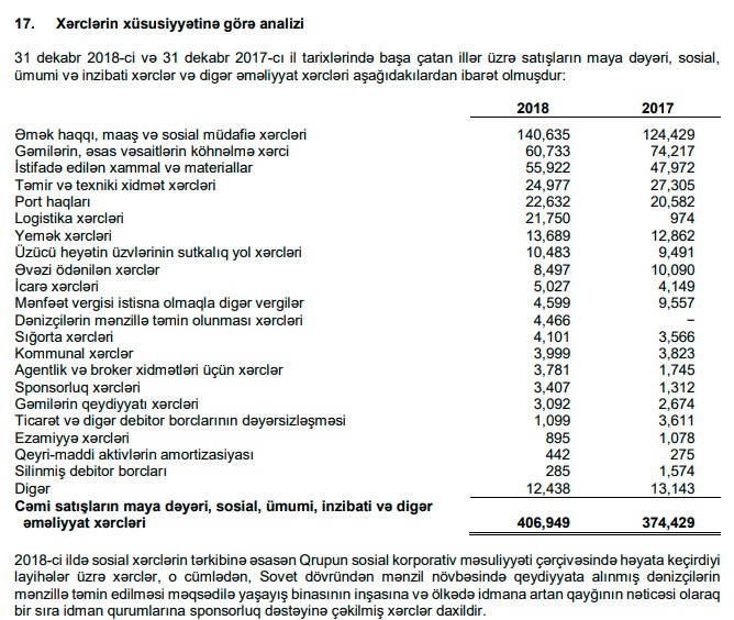 Ümumiyyətlə, 2018-ci ildə “Azərbaycan Xəzər Dəniz Gəmiçiliyi” QSC-nin 406 milyon 949 min manat cəmi xərclərinin 140 milyon 635 min manatını əməkhaqqı, maaş və sosial müdafiə xərcləri təşkil edib.