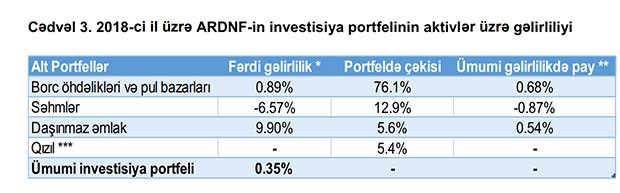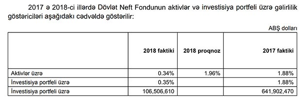 “2018-ci ildə Dövlət Neft Fondunun vəsaitlərinin idarə edilməsindən 106,5 milyon ABŞ dolları və yaxud 181,1 milyon manat məbləğində gəlir əldə edilmişdir ki, bu da büdcədə nəzərdə tutulan gəlirlərə nisbətən 1 milyard 35,6 milyon manat və yaxud 85,1 faiz azdır. Fondun investisiya portfelinin orta illik gəlirlilik göstəricisi isə 0,35 faiz təşkil etmişdir ki, bu da büdcədə nəzərdə tutulmuş gəlirlilik göstəricisi ilə (1,96% ) və 2017-cı il ilə müqayisədə (1.88%) azdır. 2017-cı ilə nisbətən gəlirliliyin aşağı olmasının əsas səbəbi kimi səhm bazarlarında mənfi gəlirliliyin qeydə alınmasıdır.