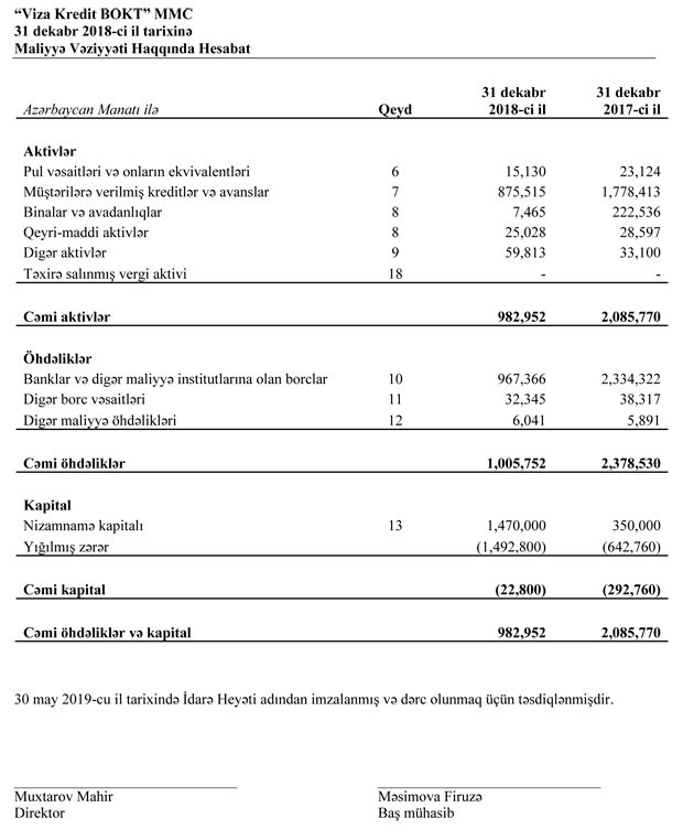 “Viza Kredit BOKT” MMC 2018-ci ili 850 min manat xalis zərər ilə başa vurub. Müqayisə üçün qeyd edək ki, təşkilat 2017-ci ili 640 min manat zərər ilə bağlamışdı. Beləliklə, illik müqayisədə “Viza Kredit”in xalis zərəri 210 min manat və ya 32,8% artıb.