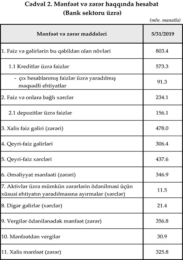 May ayında bankların əməliyyat mənfəəti 20.3% (58.5 milyon manat) artaraq 346.9 milyon manat, xalis mənfəəti isə 325.8 milyon manat təşkil edib. Ötən ilin müvafiq dövrü ilə müqayisədə faiz gəlirləri 14.6%, kreditlər üzrə faiz gəlirləri isə 18.4% artıb.