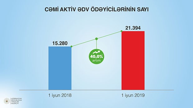 Cari ilin iyun ayının 1-nə aktiv vergi ödəyicilərinin sayı əvvəlki ilin müvafiq dövrü ilə müqayisədə 13,1 faiz artaraq 452 min 242 təşkil edib. Hesabat dövründə aktiv ƏDV ödəyicilərinin sayı 40 faiz artaraq 21 min 394-ə çatıb. Cari ilin 1 iyun tarixinə aktiv hüquqi şəxslərin sayı əvvəlki ilin müvafiq dövrü ilə müqayisədə 18,1 faiz artaraq 71 min 930-a, aktiv fiziki şəxslərin sayı isə 12,2 faiz artaraq 380 min 312-yə çatıb.