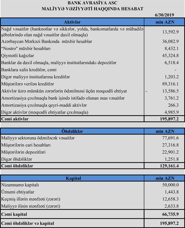Bu il İyunun sonunda “Bank Avrasiya” 129 milyon 161 min manat cəmi öhdəliklərə və 66 milyon 735 min manat cəmi kapitala malik olub. Bank ötən il İyunun sonunda 105 milyon 763 min manat cəmi öhdəliklərə və 63 milyon 681 min manat cəmi kapitala malik idi.