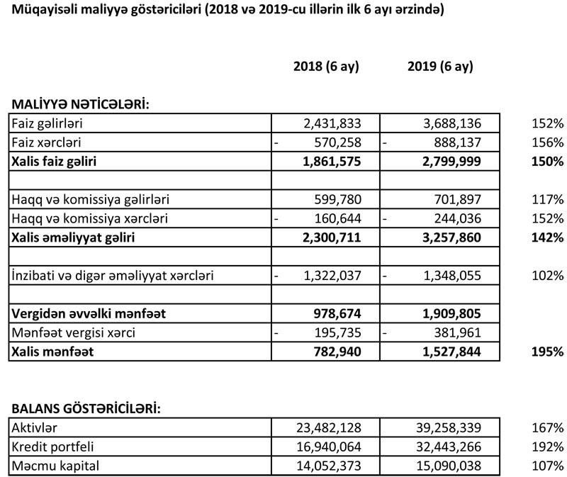 “Marja” “Embafinans”ın yarımillik maliyyə hesabatına istinadən xəbər verir ki, 2018-ci ilin ilk 6 ayında 2 milyon 432 min manat təşkil etmiş faiz gəlirləri 2019-cu ilin eyni dövründə 3 milyon 688 min manata yüksəlib. Qısası, kredit təşkilatının faiz gəlirləri 1 milyon 256 min manat və ya 52% artıb.