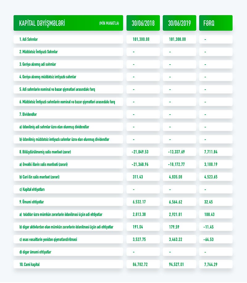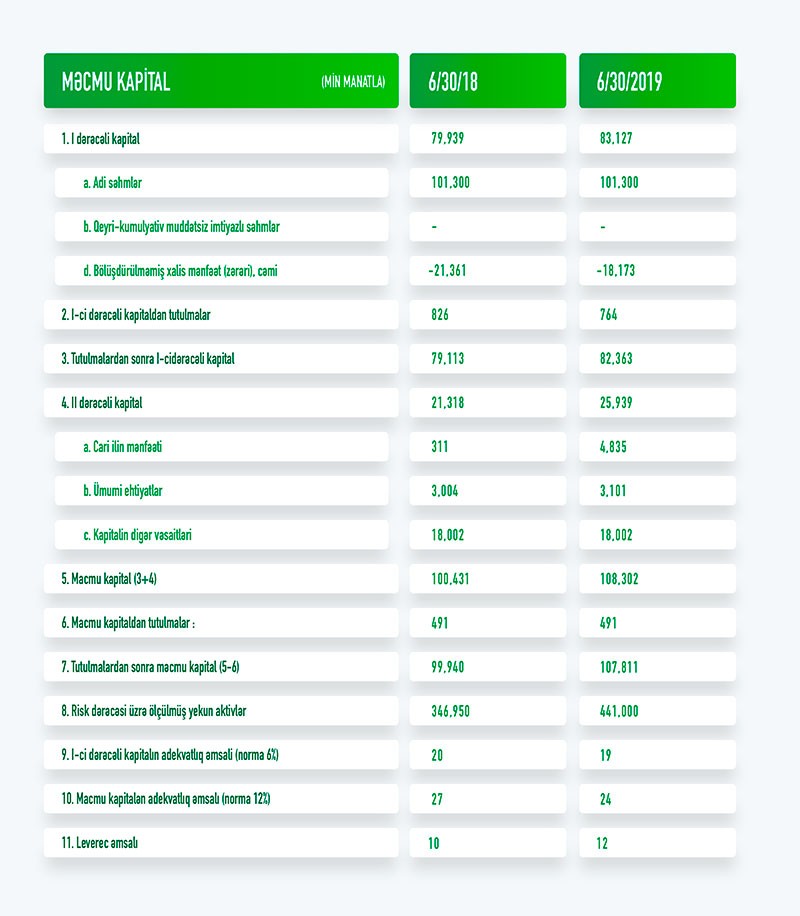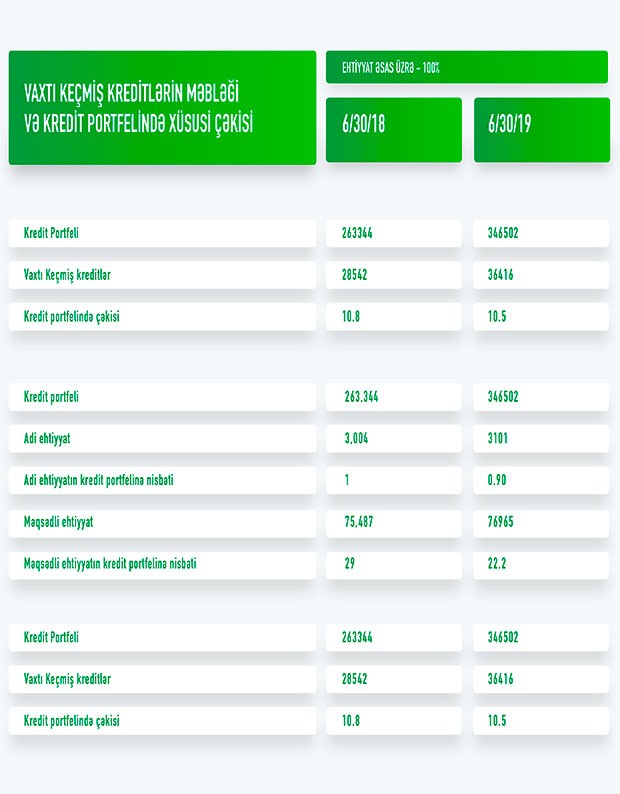 Ötən ilin 1-ci yarısının sonu ilə müqayisədə “Rabitəbank”ın müştərilərə verdiyi cəmi kreditlər 83 milyon 158 min manat və ya 31,6% artaraq 30 İyun 2019-cu il tarixində 346 milyon 502 min manata çatıb. Ötən 12 ay ərzində Bankın aktivləri isə 101 milyon 88 min manat və ya 14,2% azalaraq 611 milyon 404 min manata düşüb. Aktivlərin azalmasının səbəbi likvid aktivlərin azalmasıdır. Öhdəliklərdə yer alan müştərilərin cari hesablarındakı vəsaitlərin 98 milyon 348 min manat və ya 31,2% azalaraq 216 milyon 457 min manata düşməsilə əlaqədar olaraq likvid aktivlər də azalıb.