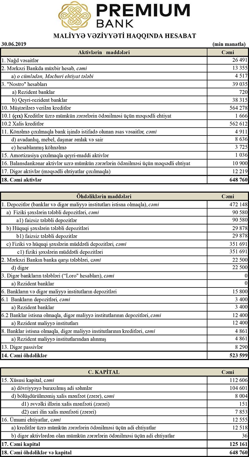 30 İyun 2019-cu il tarixində “Premium Bank” 648 milyon 760 min manat cəmi aktivlərə, 523 milyon 599 min manat cəmi öhdəliklərə və 125 milyon 161 min manat cəmi balans kapitalına malik olub.