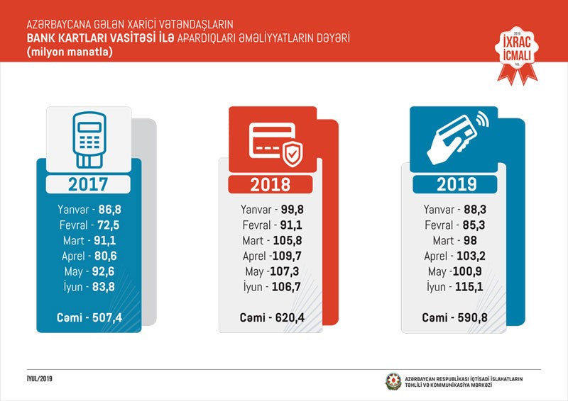 Müqayisə üçün qeyd etək ki, 2018-ci ilin yanvar-iyun ayları ərzində Azərbaycana dünyanın 189 ölkəsindən 1 milyon 325 min əcnəbi gəlmişdi. Həmin müddət ərzində Azərbaycana gələn xarici vətəndaşların bank kartları vasitəsi ilə apardıqları əməliyyatların dəyəri 620,4 milyon manat təşkil etmişdi.