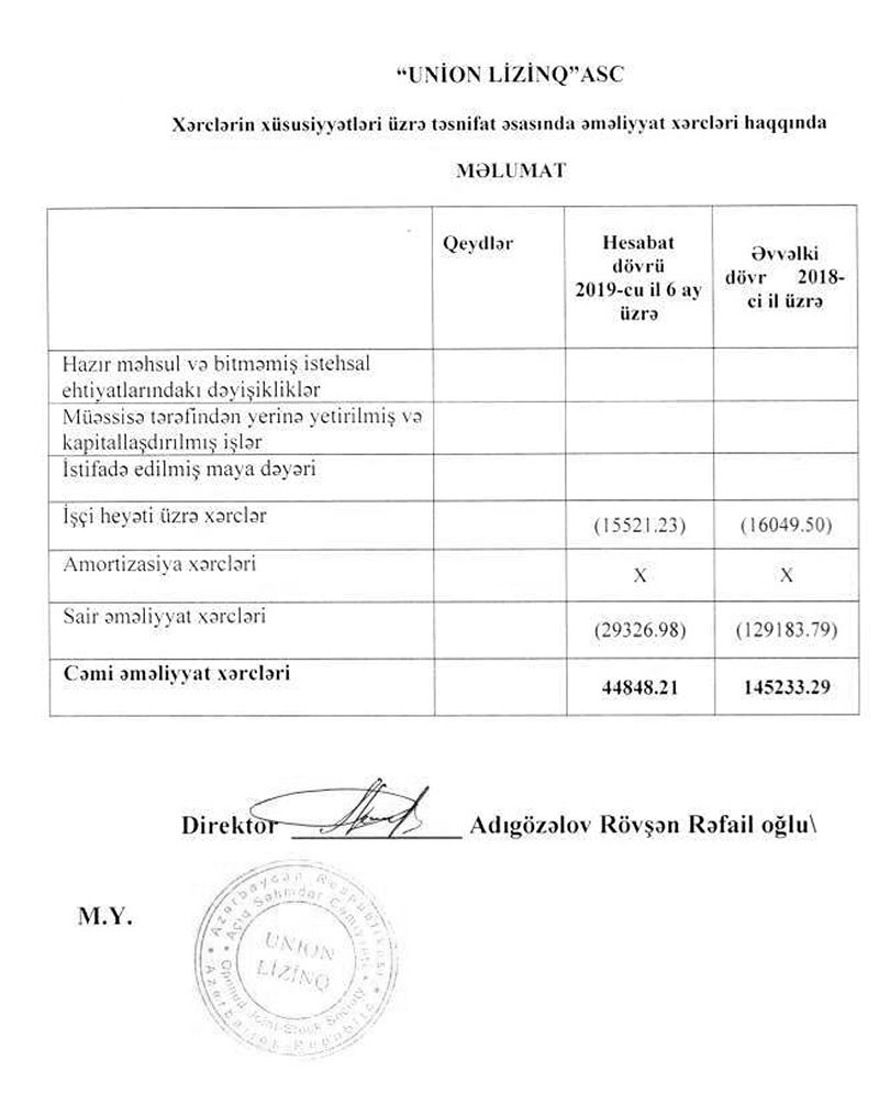 30 İyun 2019-cu il tarxində “Union Lizinq” 4 milyon 547 min manat yığılmış zərərə malik olub.