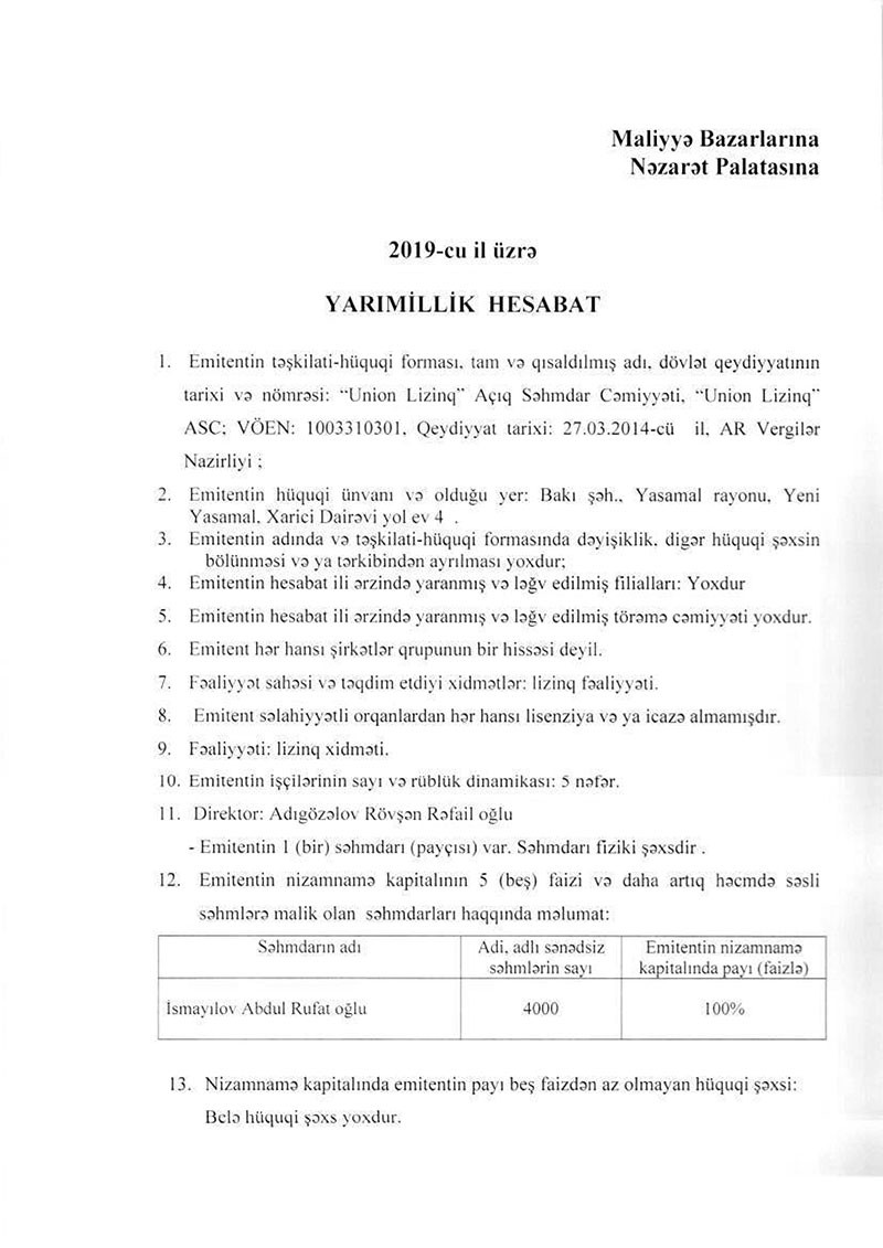 100 faiz İsmayılov Abdula məxsus olan “Union Lizinq” ASC 2019-cu ilin ilk 6 ayını 323 min manat xalis mənfəət ilə başa vurub. Ötən ilin eyni dövrü ilə müqayisədə şirkətin mənfəəti 15,4% azalıb. Belə ki, “Union Lizinq” 2018-ci ilin ilk 6 ayını 382 min manat xalis mənfəət ilə bağlamışdı. Mənfətin azalması gəlirin azalması ilə bağlıdır.