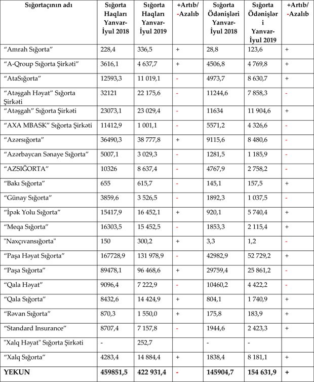 Azərbaycanın 22 sığorta şirkətindən 12-si ötən ilin 7 ayı ilə müqayisədə 2019-cu ilin 7 ayı ərzində daha az sığorta haqları toplayıblar. 9 sığorta şirkətinin topladığı sığorta haqları artıb, 1 sığorta şirkəti isə bu il fəaliyyətə başladığından müqayisəsi yoxdur.