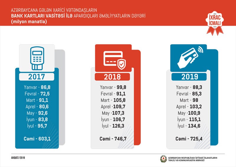 Ümumilikdə isə 2019-cu ilin yanvar-iyul ayları ərzində Azərbaycana gələn xarici vətəndaşların bank kartları vasitəsi ilə apardıqları əməliyyatların dəyəri 725,4 milyon manat təşkil edib.