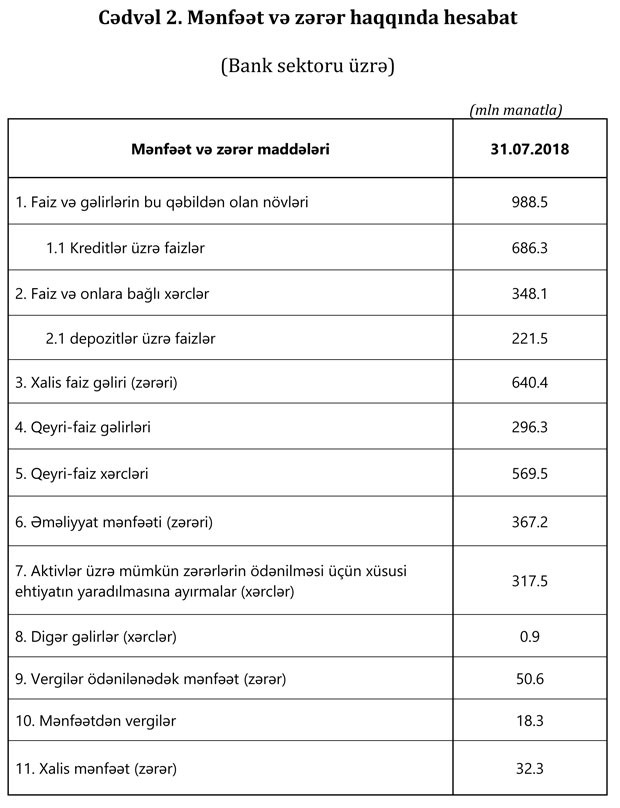 "Marja" xəbər verir ki, ötən ilin eyni dövründə bankların əməliyyat mənfəəti 367.2 milyon manat, xalis mənfəəti 32.3 milyon manat təşkil etmişdi. Ötən ilin 7 ayı ilə müqayisədə bank sektorunda xalis mənfəət 12,6 dəfə artıb.