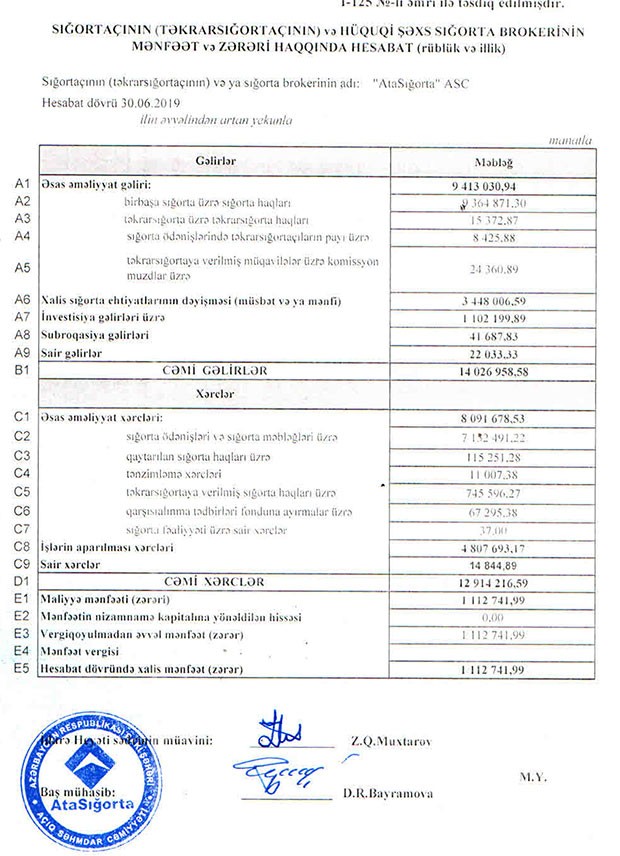 100% "AtaHoldinq" şirkətinə məxsus olan "AtaSığorta" ASC 2019-cu ilin 1-ci yarısını 1 milyon 113 min manat xalis mənfəət ilə başa vurub. Halbuki, şirkət ötən ilin eyni dövrünü 2 milyon 350 min manat xalis zərər ilə bağlamışdı. Bu il "AtaSığorta"nın mənfəətə çıxması ehtiyatdan azadolma və işlərin aparılması xərclərinin azaldılması hesabına baş verib. Şirkətin topladığı sığorta haqları azalıb, sığorta ödənişləri isə artıb.