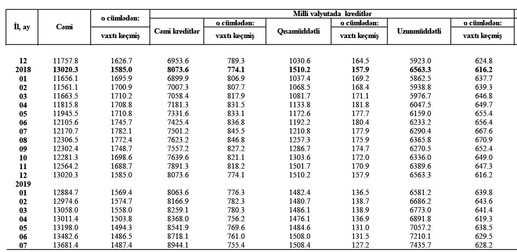 Kredit təşkilatlarının cəmi kredit qoyuluşları 2018-ci ilin sonu ilə müqayisədə 2019-cu ilin 7 ayı ərzində 661,1 milyon manat, İyun ayı ilə müqayisədə İyul ayında isə 198,8 milyon manat artaraq 1 Avqust 2019-cu il tarixində 13 milyard 681.4 milyon manata çatıb.
