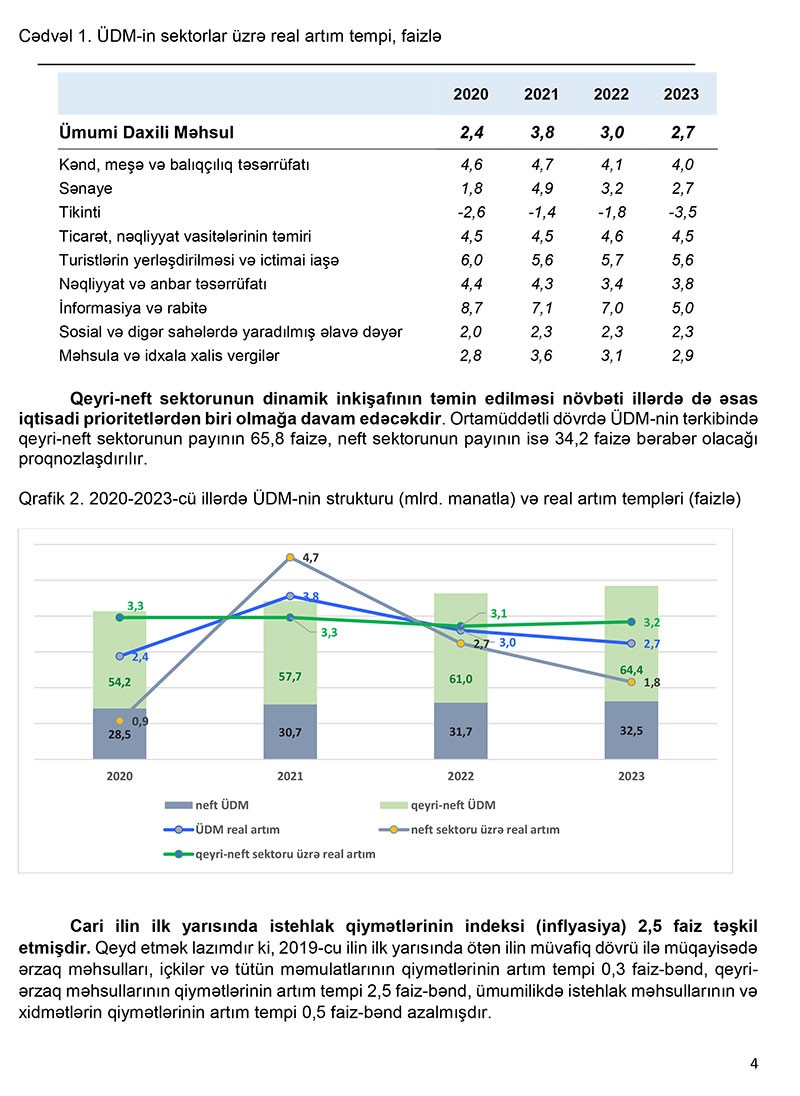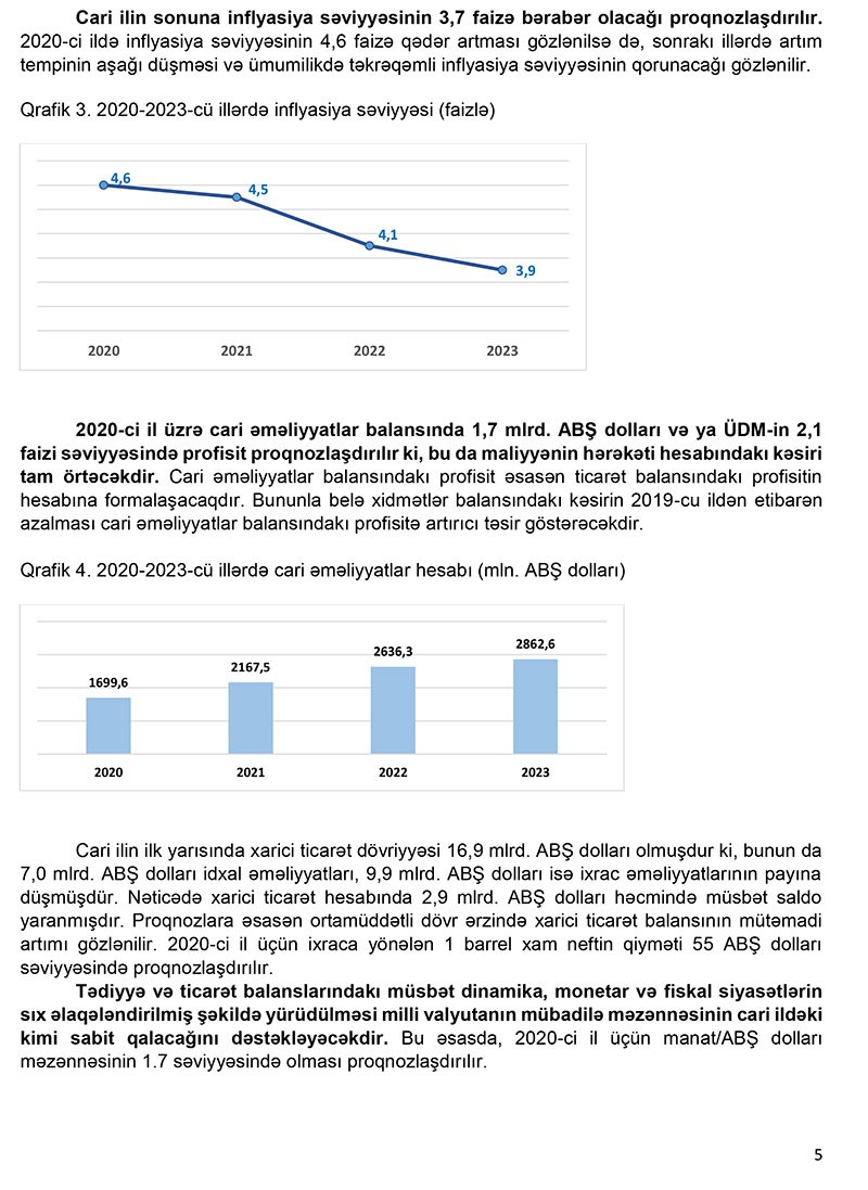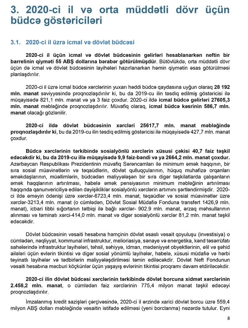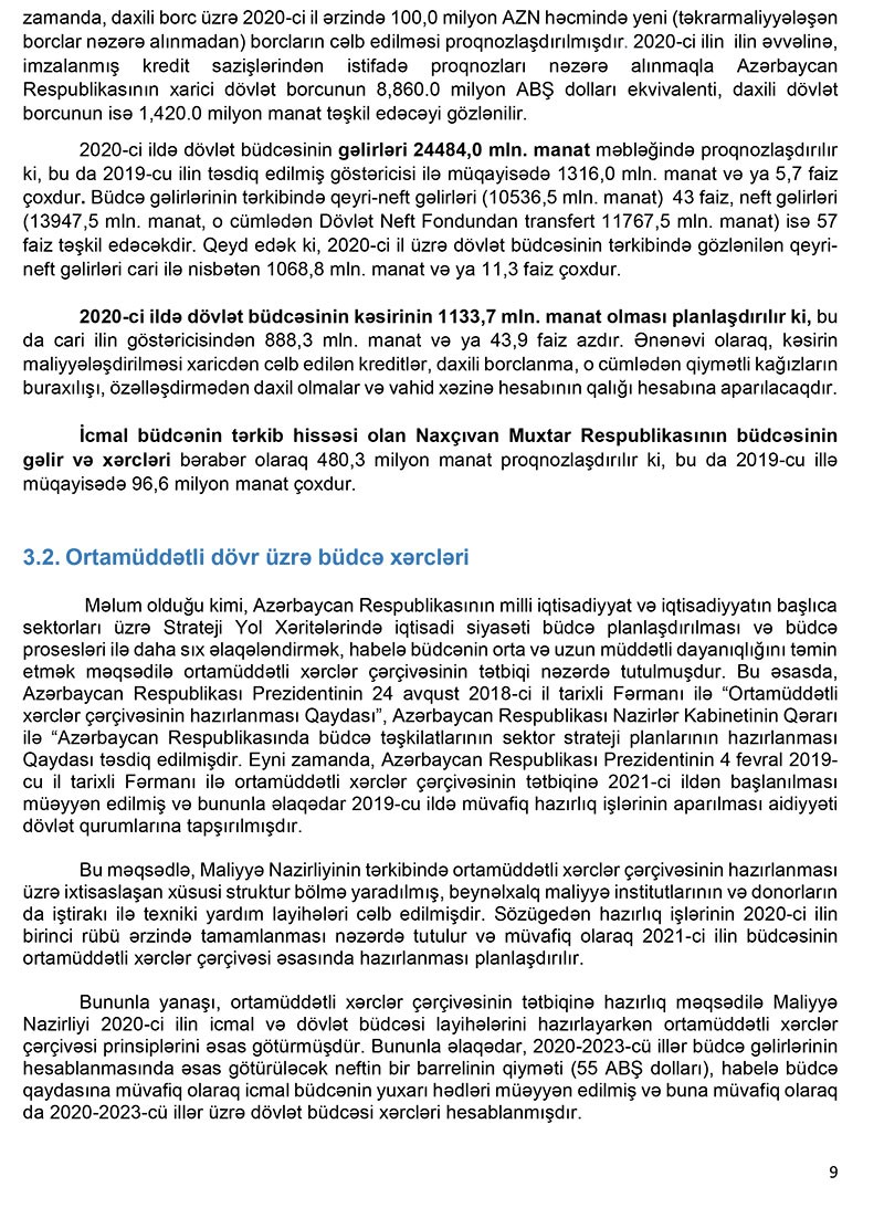 Eyni 9 zamanda, daxili borc üzrə 2020-ci il ərzində 100 milyon manat həcmində yeni (təkrarmaliyyələşən borclar nəzərə alınmadan) borcların cəlb edilməsi proqnozlaşdırılmışdır.