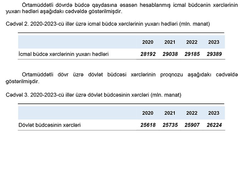 2020-ci il üzrə icmal büdcə xərclərinin yuxarı həddi büdcə qaydasına uyğun olaraq 28 milyard 192 milyon manat səviyyəsində proqnozlaşdırılır ki, bu da 2019-cu ilin təsdiq edilmiş göstəricisi ilə müqayisədə 821,1 milyon manat və ya 3 faiz çoxdur.