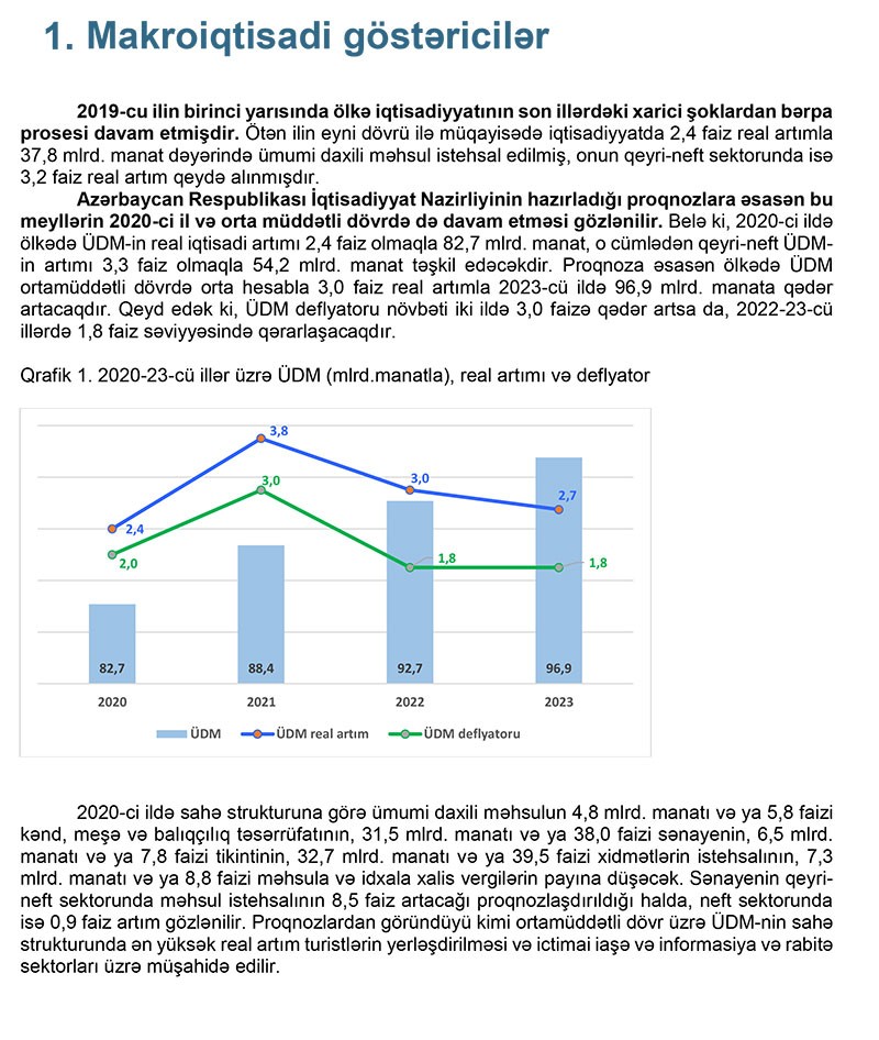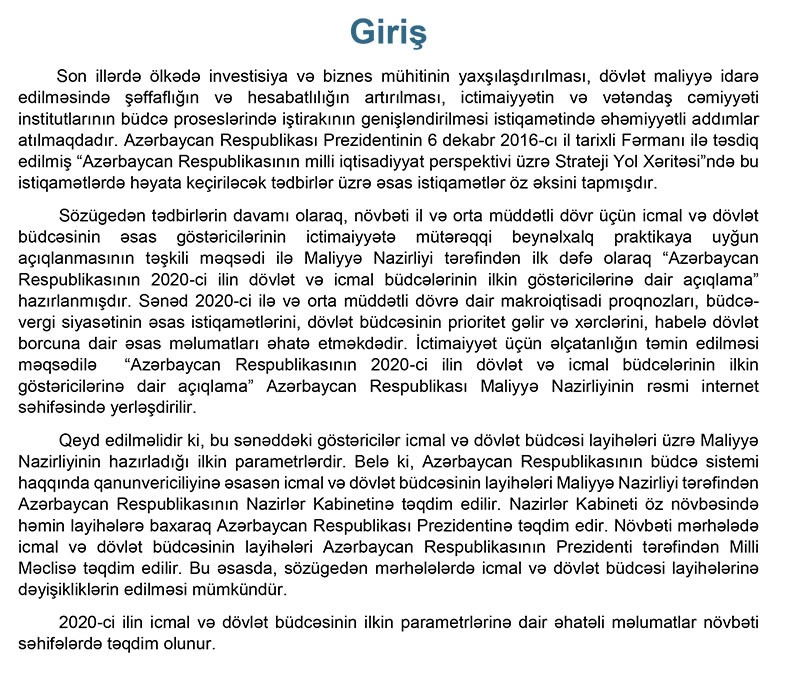 göstəricilərinə dair açıqlamasında bildirilir ki, 2020-ci ildə icmal büdcə gəlirləri 27 milyard 605,3 milyon manat məbləğində proqnozlaşdırılır. Müvafiq olaraq, icmal büdcə kəsrinin 586,7 milyon manat olacağı gözlənilir.