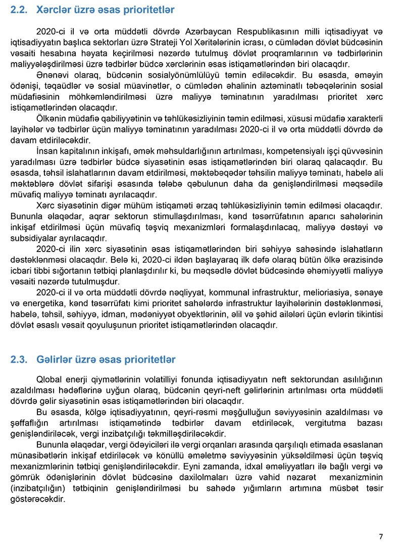 2020-ci ildə əməyin ödənişi üzrə xərclər 6 milyard 723,4 milyon manat, təqaüdlər və sosial müavinətlər üzrə xərclər 3 milyard 213,4 milyon manat (o cümlədən, Dövlət Sosial Müdafiə Fonduna transfert 1 milyard 426,9 milyon manat), icbari tibbi sığortanın tətbiqi ilə bağlı xərclər 902.9 milyon manat, ərzaq məhsullarının alınması və təminatı xərci 414 milyon manat və digər sosialyönlü xərclər 81,2 mln. manat təşkil edəcəkdir.