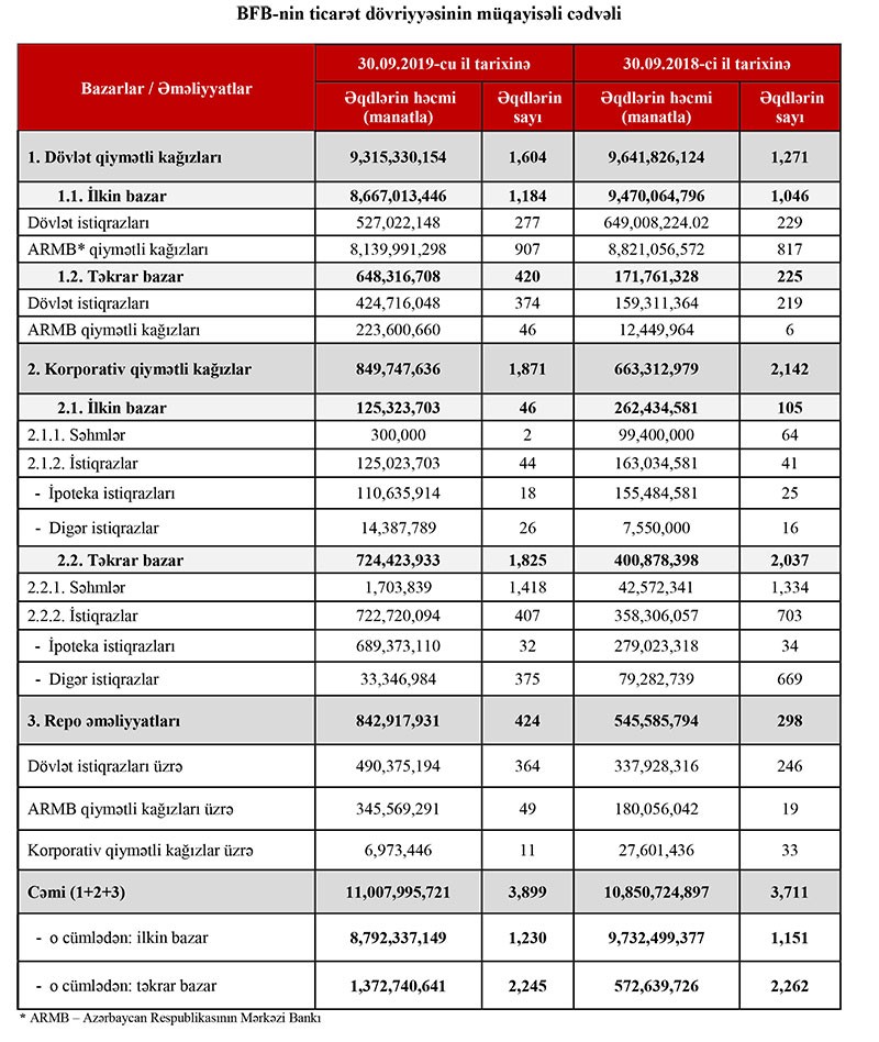 Ötən ilin 9 ayı ilə müqayisədə 2019-cu ilin 9 ayı ərzində qiymətli kağızlar üzrə keçirilən əməliyyatların həcmi 1.45% artıb. Belə ki, 2018-ci ilin analoji dövründə əməliyyatların həcmi 10 milyard 851 milyon manat təşkil etmişdi.