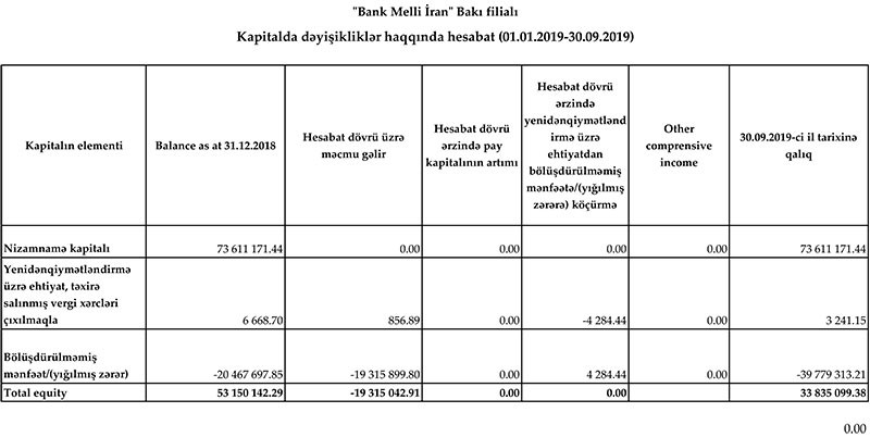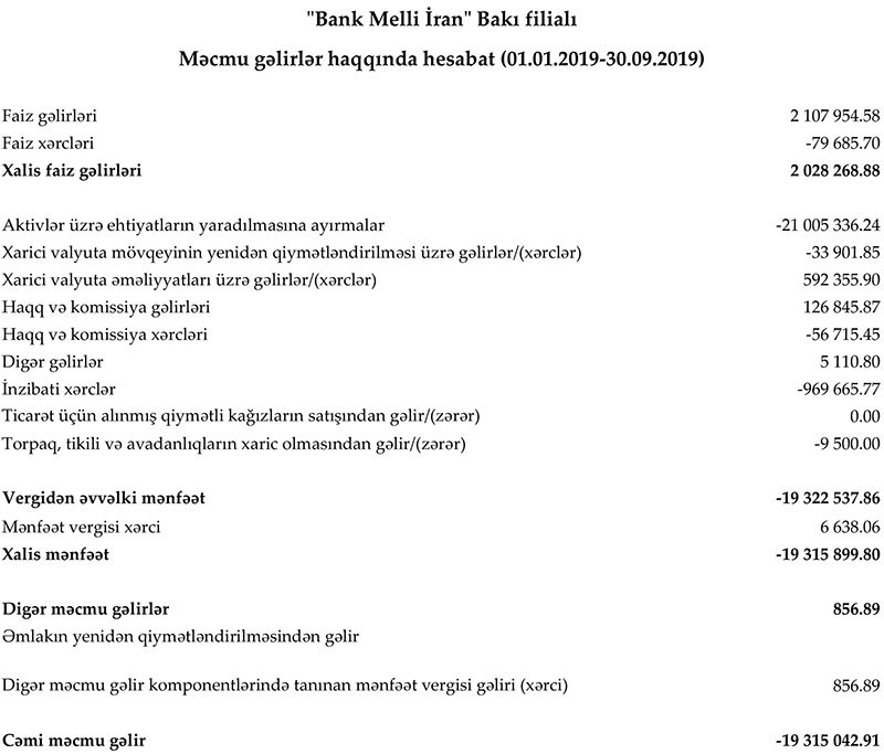 "Bank Melli İran" Bakı filialı 2019-cu ilin 9 ayını (yanvar-sentyabr dövrünü) 19 milyon 315 min manat zərər ilə başa vurub. 3-cü rübdə (iyul-sentyabr) Bankın zərəri 2 milyon 400 min manat da artıb. Filial cari ilin 6 ayını 16 milyon 905 min manat zərər ilə bağlamışdı.
