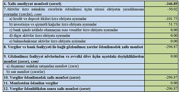 “Marja” Bankın rüblük hesabatlarına istinadən xəbər verir ki, cari ilin yanvar-sentyabr dövründə Pakistan Milli Bankının Bakı filialının cəmi gəlirləri 300 min manat, cəmi xərcləri isə 647 min manat təşkil edib. Xərclər gəlirləri üstələdiyindən Bankın 347 min manat əməliyyat zərəri yaranıb. Ehtimal olunan kredit və depozit itkiləri üçün yaradılmış ehtiyatın 50 min manatının azad olması hesabına zərər 297 min manata düşüb.