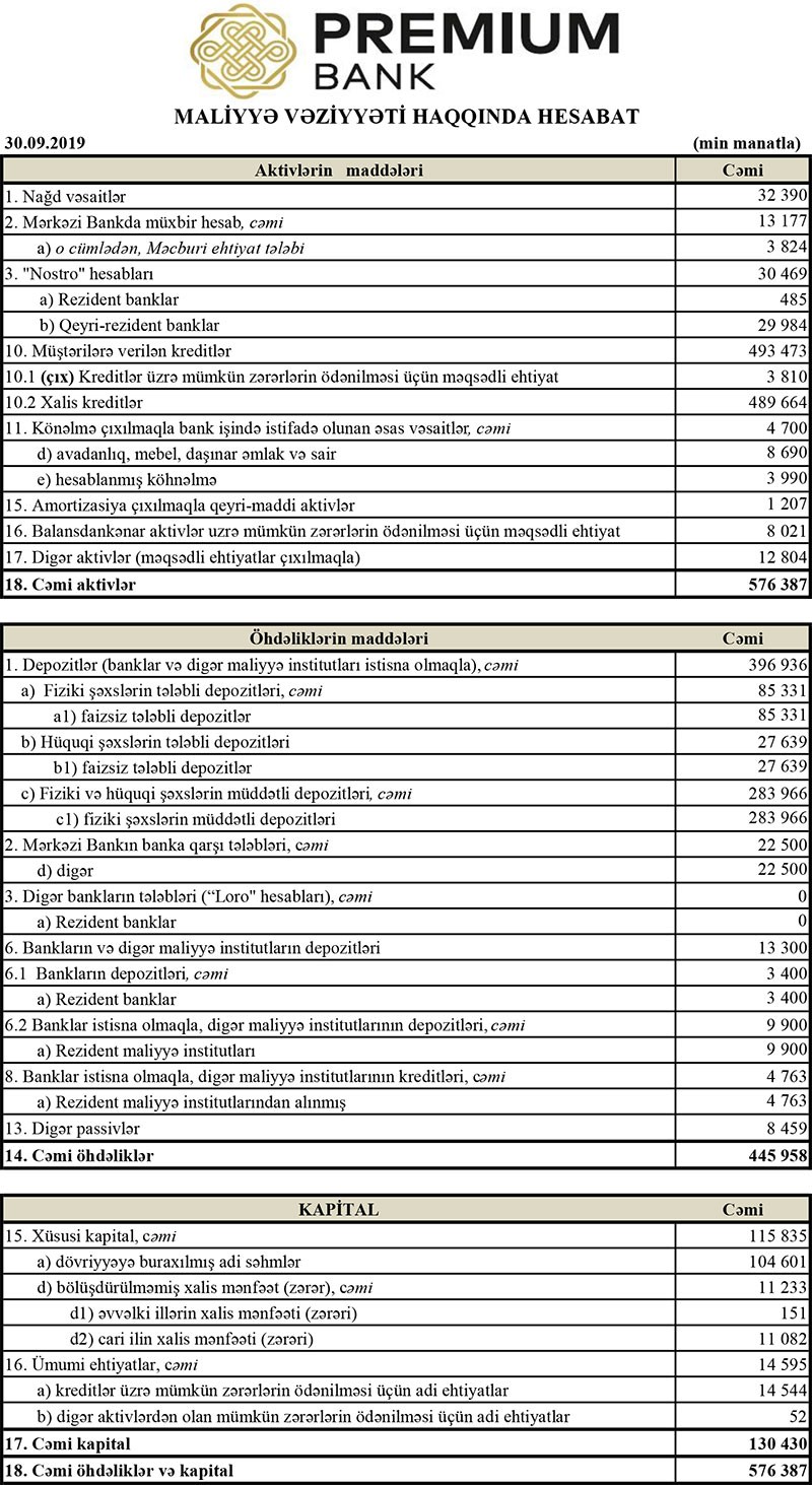 30 Sentyabr 2019-cu il tarixində “Premium Bank” 576 milyon 387 min manat cəmi aktivlərə malik olub və aktivlərin 493 milyon 473 min manatını müştərilərə verilən kreditlər təşkil edib. 31 Dekabr 2018-ci il tarixində “Premium Bank” 646 milyon 284 min manat cəmi aktivlərə malik olmuş və aktivlərin 584 milyon 596 min manatını müştərilərə verilən kreditlər təşkil etmişdi. Beləliklə, cari ilin 9 ayında “Premium Bank”ın cəmi aktivləri 69 milyon 897 min manat, müştərilərə verilən kreditlər isə 91 milyon 123 min manat azalıb.