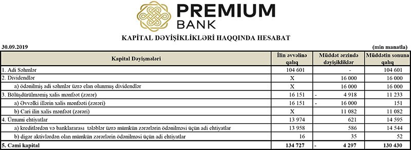 2018-ci ilin sonu ilə müqayisədə “Premium Bank”ın cəmi kapitalı 4 milyon 297 min manat azalaraq 130 milyon 430min manata düşüb.