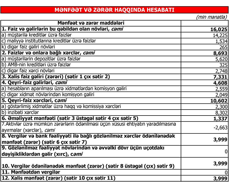 Qeyd edək ki, dövr ərzində əmanətlərdə 3% artım qeydə alınıb və nəticə etibarilə əmanət portfeli 119 milyon 549 min manatadək yüksəlib.