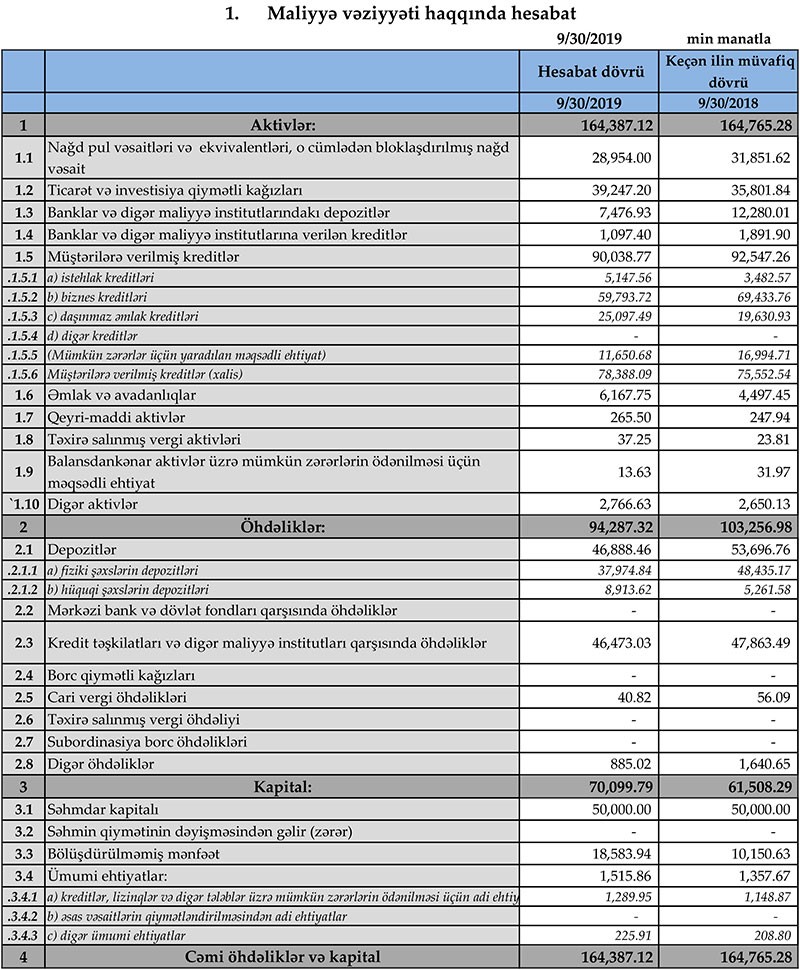 30 Sentyabr 2018-ci il tarixi ilə müqayisədə Bankda depozitlər 6 milyon 808 və ya 12,7% azalaraq 46 milyon 888 min manata düşüb. Bankda fiziki şəxslərin depozitləri 10 milyon 460 min manat azalaraq 37 milyon 974 min manata geriləyib.