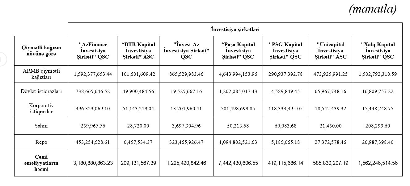 “Marja” Bakı Fond Birjasına istinadən xəbər verir ki, 7 milyard 442 milyon manat dövriyyə ilə “Paşa Kapital İnvestisiya Şirkəti” 1-ci, 3 milyard 180 milyon manat dövriyyə ilə "AzFinance İnvestisiya Şirkəti" 2-ci, 1 milyard 562 milyon manat dövriyyə ilə "Xalq Kapital İnvestisiya Şirkəti" 3-cü yeri tutub.