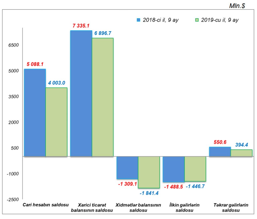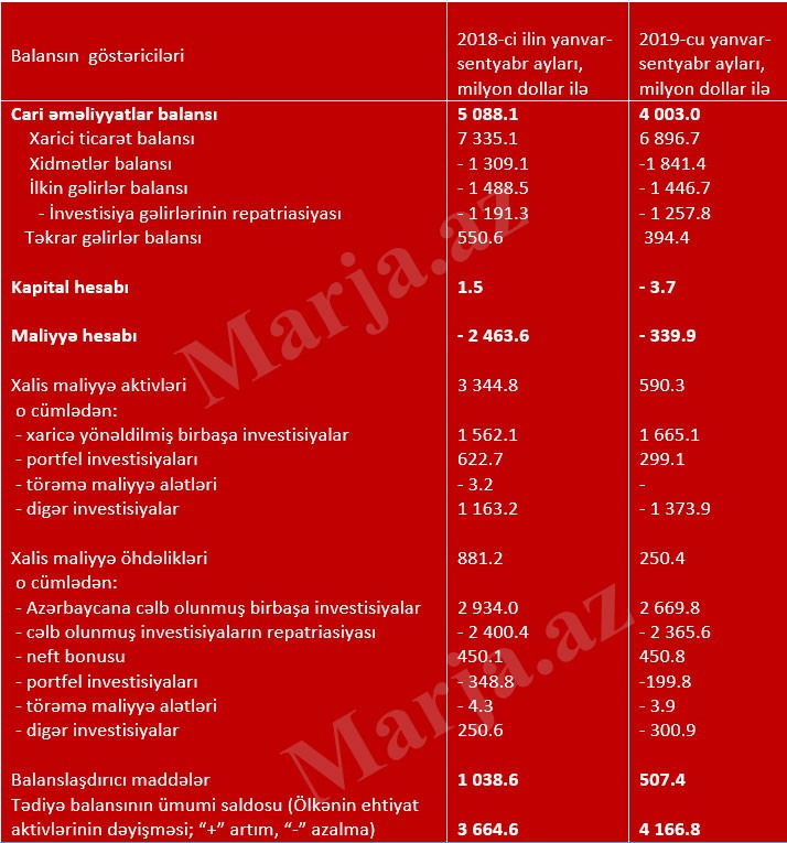 Tədiyyə balansı göstəricilərini təhlil etdikdə məlum olur ki, artım maliyyə hesabı kəsirinin azalması və balanslaşdırıcı maddәlәrin artması hesabınadır. Belə ki, 2018-ci ilin 9 ayı ilə müqayisədə 2019-cu ilin 9 ayında Azərbaycanın cari hesabı (cari əməliyyatlar balansının saldosu) 1 milyard 85 milyon dollar azalaraq 4 milyard 3 milyon dollar təşkil edib. Ötən ilin 9 ayı üzrə cari hesab 5 milyard 88 milyon dollar idi.