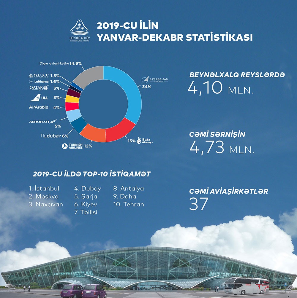 Paytaxt hava limanı – Heydər Əliyev Beynəlxalq Aeroportu həmçinin yeni rekorda imza ataraq 4,73 milyon sərnişinə xidmət göstərmişdir ki, bu da 2018-ci ilin göstəricisindən 7% çoxdur.