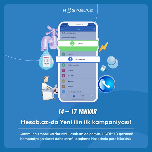 Kampaniya 14-17 Yanvar tarixlərində Hesab.az veb səhifəsi və mobil tətbiqində ödəniş edən qeydiyyatlı istifadəçiləri əhatə edir. Belə ki, həm Hesab.az mobil tətbiqində, həm də veb səhifəsində qeydiyyatlı şəkildə bir dəfə iştirak edərək, kommunal + mobil və ya hər hansı birinə müəyyən edilmiş məbləğdə ödəniş etdikdə müxtəlif hədiyyələr qazanmış olacaqlar.