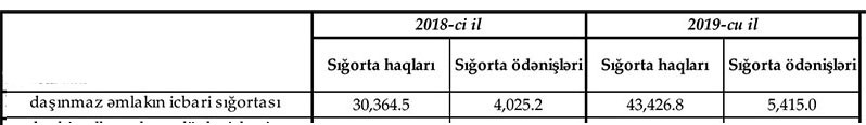 Daşınmaz əmlakın icbari sığortası üzrə sığorta ödənişləri aşağıdır. 2018-ci ildə 4 milyon 25 min manat təşkil etmiş sığorta ödənişləri 2019-cu ildə 5 milyon 415 min manata yüksəlib.
