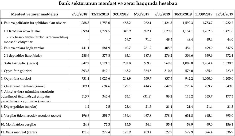 Faiz gəlirlərinin artması ilə bankların əməliyyat mənfəəti ötən il 154.4 milyon manat artaraq 849 milyon manata yüksəlib. Banklar 2018-ci ildə 694.6 milyon manat əməliyyat mənfəəti əldə etmişdilər.