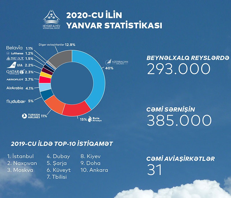 Heydər Əliyev Beynəlxalq Aeroportunun mətbuat xidmətinin yaydığı məlumata görə, onların 336 mininə Heydər Əliyev Beynəlxalq Aeroportunda xidmət göstərilmişdir ki, bu da 2019-cu ilin yanvar ayı ilə müqayisədə 40 min nəfər artıqdır.