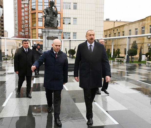 Prezident İlham Əliyev Mərkəzi Neftçilər Xəstəxanasının yanında Şah İsmayıl Xətainin heykəlinin köçürüldüyü yeni salınmış parka gəldi.