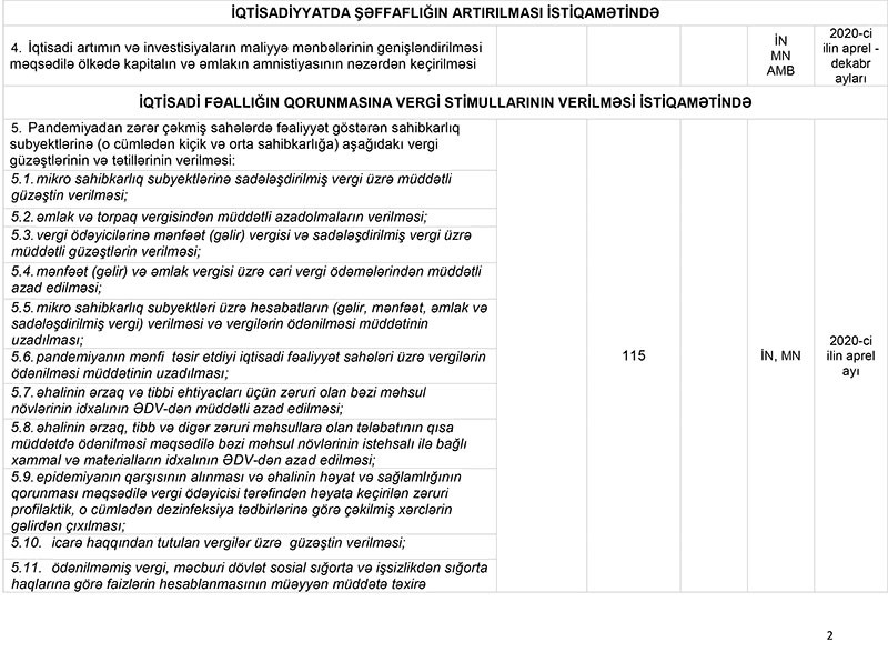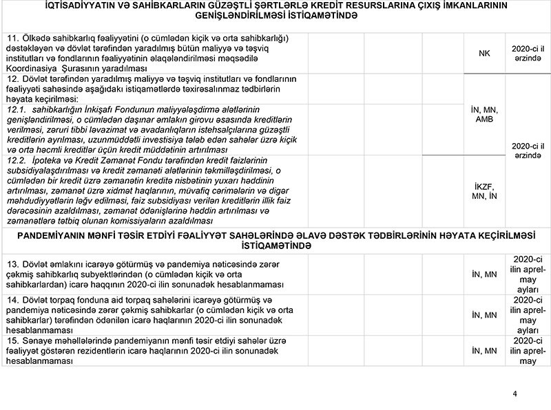 Nazirlər Kabineti “Koronavirus (COVID-19) pandemiyasının və bundan irəli gələrək dünya enerji və səhm bazarlarında baş verən kəskin dalğalanmaların Azərbaycan Respublikasının iqtisadiyyatına, makroiqtisadi sabitliyə, ölkədə məşğulluq məsələlərinə və sahibkarlıq subyektlərinə mənfi təsirinin azaldılması ilə bağlı bir sıra tədbirlər haqqında” Azərbaycan Respublikası Prezidentinin 2020-ci il 19 mart tarixli 1950 nömrəli Sərəncamının 10.2-ci bəndinin icrası ilə bağlı Tədbirlər Planı”nı təsdiq edib.
