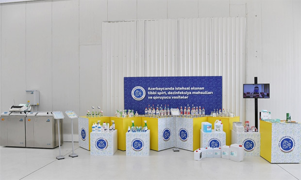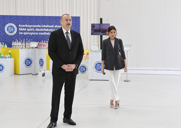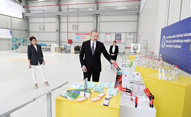 Sonra dövlətimizin başçısına və birinci xanıma Azərbaycanda istehsal olunan tibbi spirt, dezinfeksiya məhsulları və qoruyucu vasitələr barədə məlumat verildi.