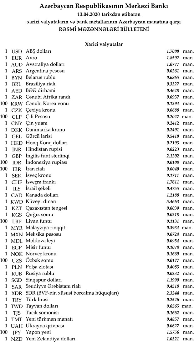 2020-ci ilin Aprel ayının 13-nə Mərkəzi Bankın açıqladığı rəsmi Dollar/Manat məzənnəsi Aprelin 10-u ilə müqayisədə dəyişməyərək 1,7000 manatda qalıb, Avro/manat məzənnəsi 1.8592 manata düşüb, Rubl/manat məzənnəsi isə 0,0232 manata qalxıb.