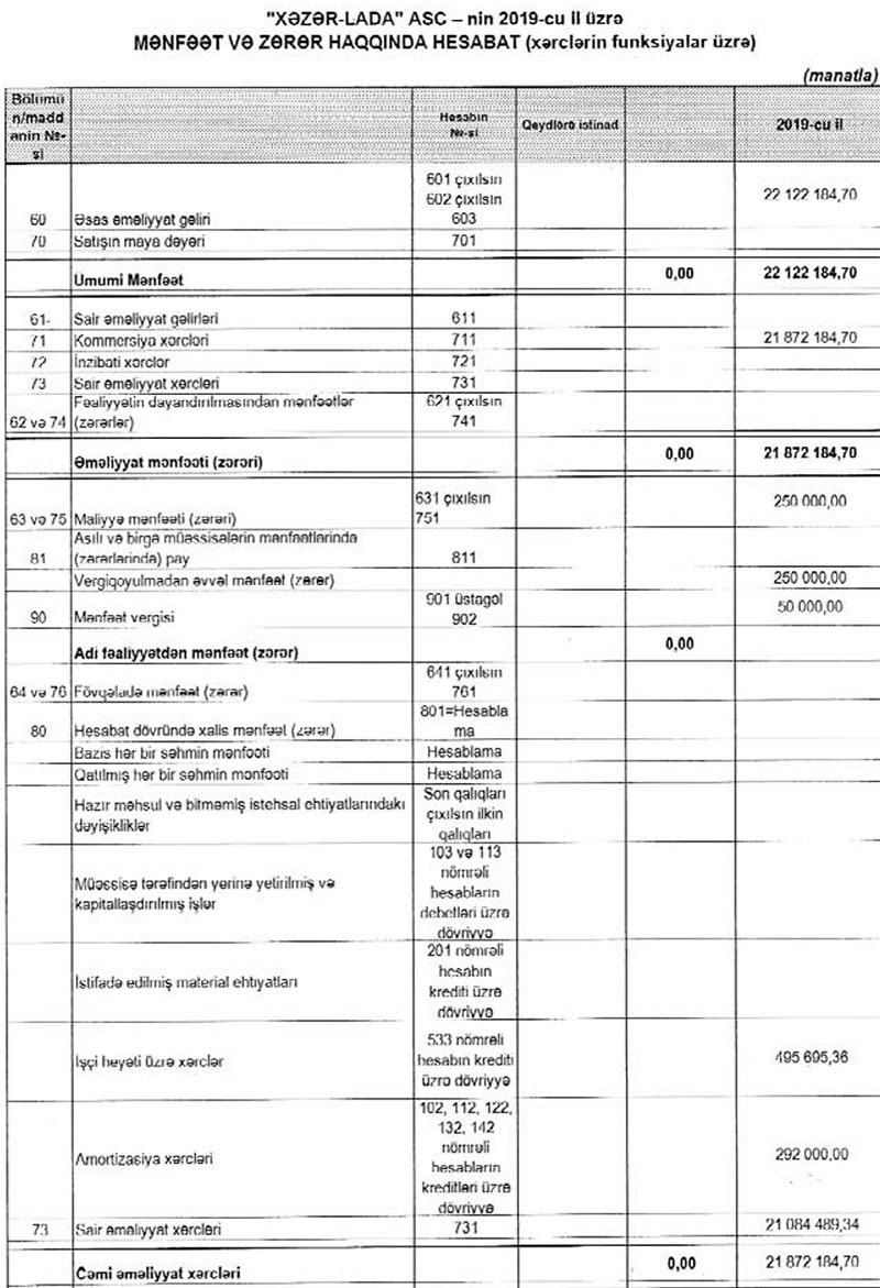 Müqayisə üçün qeyd edək ki, 2018-ci ildə “Xəzər-Lada”nın cəmi gəlirləri 16 milyon 446 min manat, xəmi xərcləri isə 16 milyon 229 min manat təşkil etmişdi. Beləliklə, ötən il gəlirləri artan “Xəzər-Lada” mənfəətini artırmağa nail olmayıb.