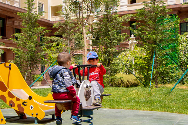 Dörd binanın həyəti kənardan girişlərə qapadılaraq yalnız sakinlərin istirahəti üçün aktiv zona kimi nəzərdə tutulub. Burada yaşıllıq, ağaclar, xüsusi qaçış və velosiped zolaqları, voleybol və basketbol meydançası, tennis kortu, uşaqlar üçün oyun meydançaları, velo parkinq əhalinin ixtiyarındadır.