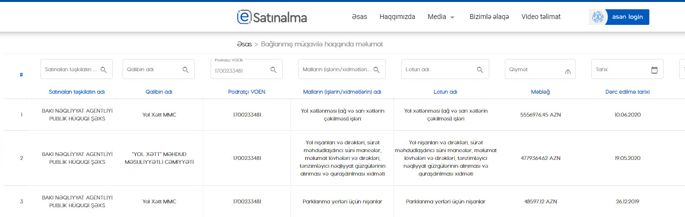 Marja elektron satınalmalar portalına istinadən xəbər verir ki, tenderin qalibi "Yol Xətt" MMC-dir.