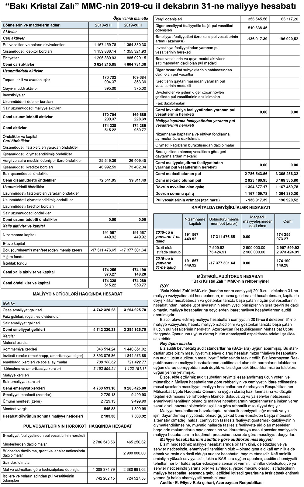 31 Dekabr 2019-cu il tarixində “Bakı Kristal Zalı” 174 milyon 289 min 959 manat cəmi aktivlərə malik olub və aktivlərin 169 milyon 684 min 853 manatını torpaq, tikili və avadanlıqlar təşkil edib.