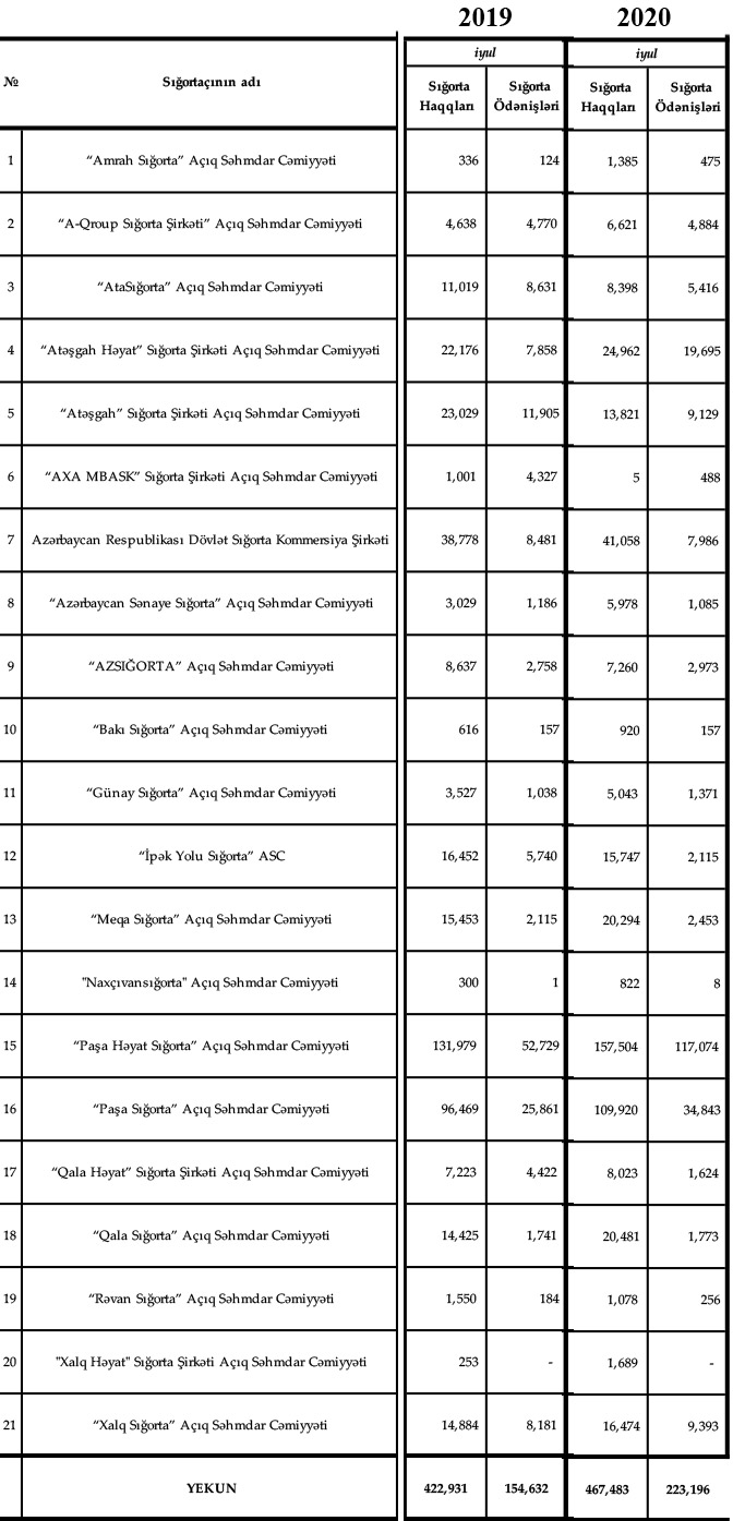 2020-ci ilin 7 ayı ərzində Azərbaycanın 21 sığorta şirkəti tərəfindən 467 milyon 483 min manat sığorta haqları toplanıb. Bu, ötən ilin eyni dövrü ilə müqayisədə 44 milyon 552 min manat və ya 10,5% çoxdur.