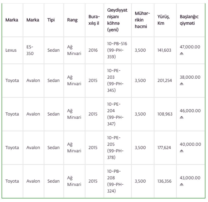Avtomobillər haqqında ətraflı məlumat və başlanğıc qiyməti aşağıda göstərilib: