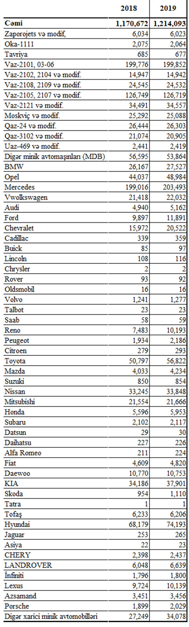 Dövlət Statistika Komitəsi 2019-cu il üçün Azərbaycanda minik avtomobillərinin marka strukturunu açıqlayıb.